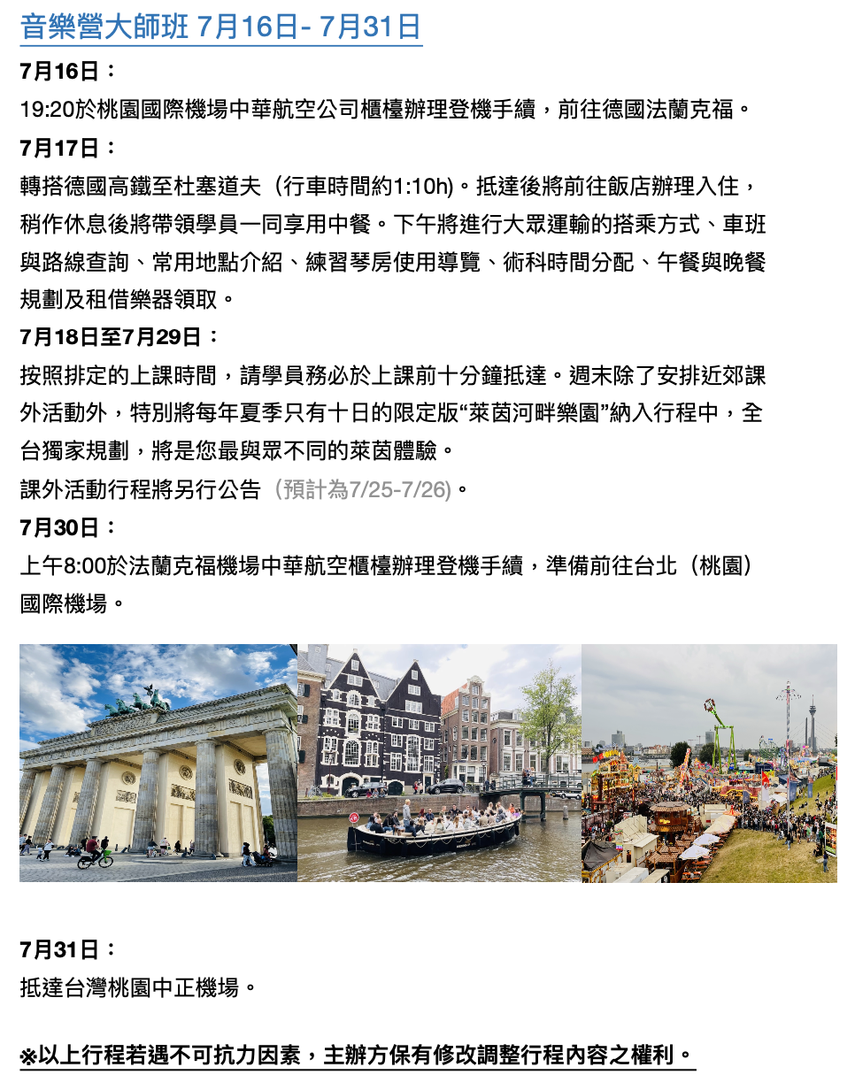7/16 - 7/31 音樂營大師班 術科課程&課外活動